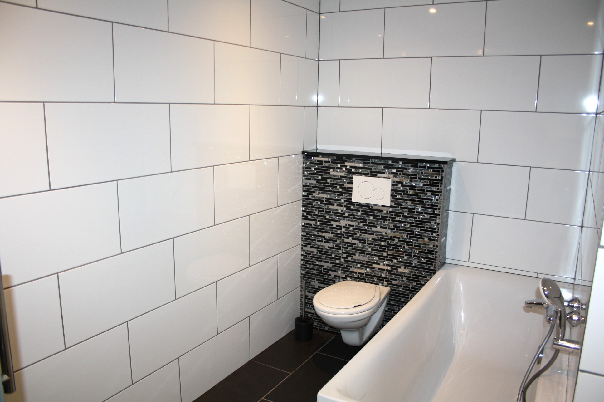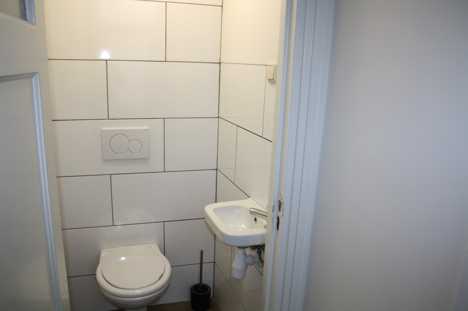 Geheel betegelde badkamer (1.65 x 3.45) met ligbad, douche met douchecabine, tegelvloer en 2e toilet.