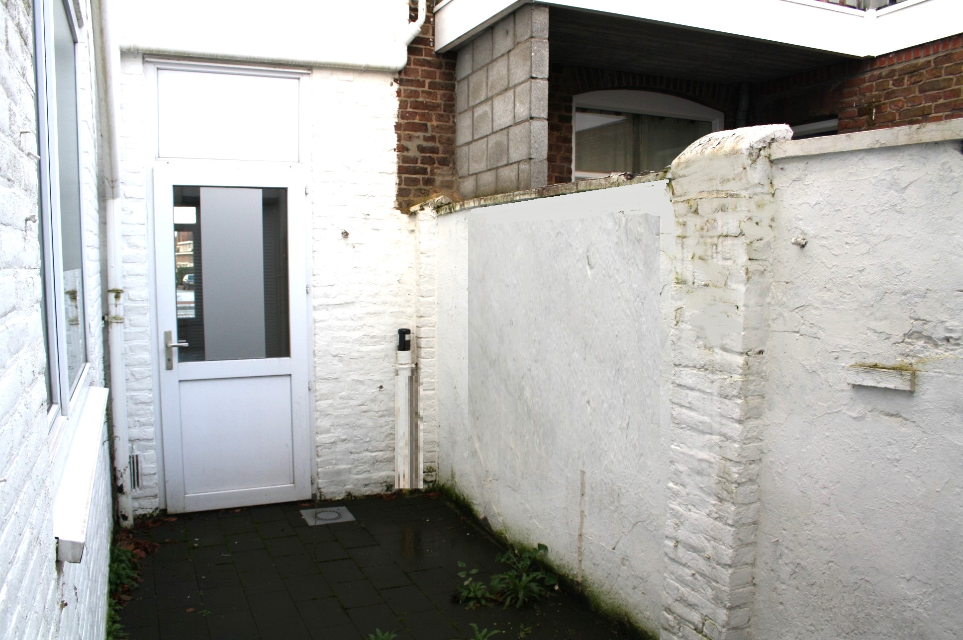 Gemeenschappelijke hal/entree. Ruime woonkamer (8.55 x 4.08) met tegelvloer in hout "look" en deur naar patiotuin. Hal naar gesloten leefkeuken (4.34 x 3.20). De keuken is voorzien van een moderne aanbouwkeuken met wasmachineaansluiting en apparatuur (oven, 4-pitsgaskookplaat, afzuigkap). Halfhoog betegeld toilet met fonteintje. Vanuit de keuken is tevens de patiotuin bereikbaar.