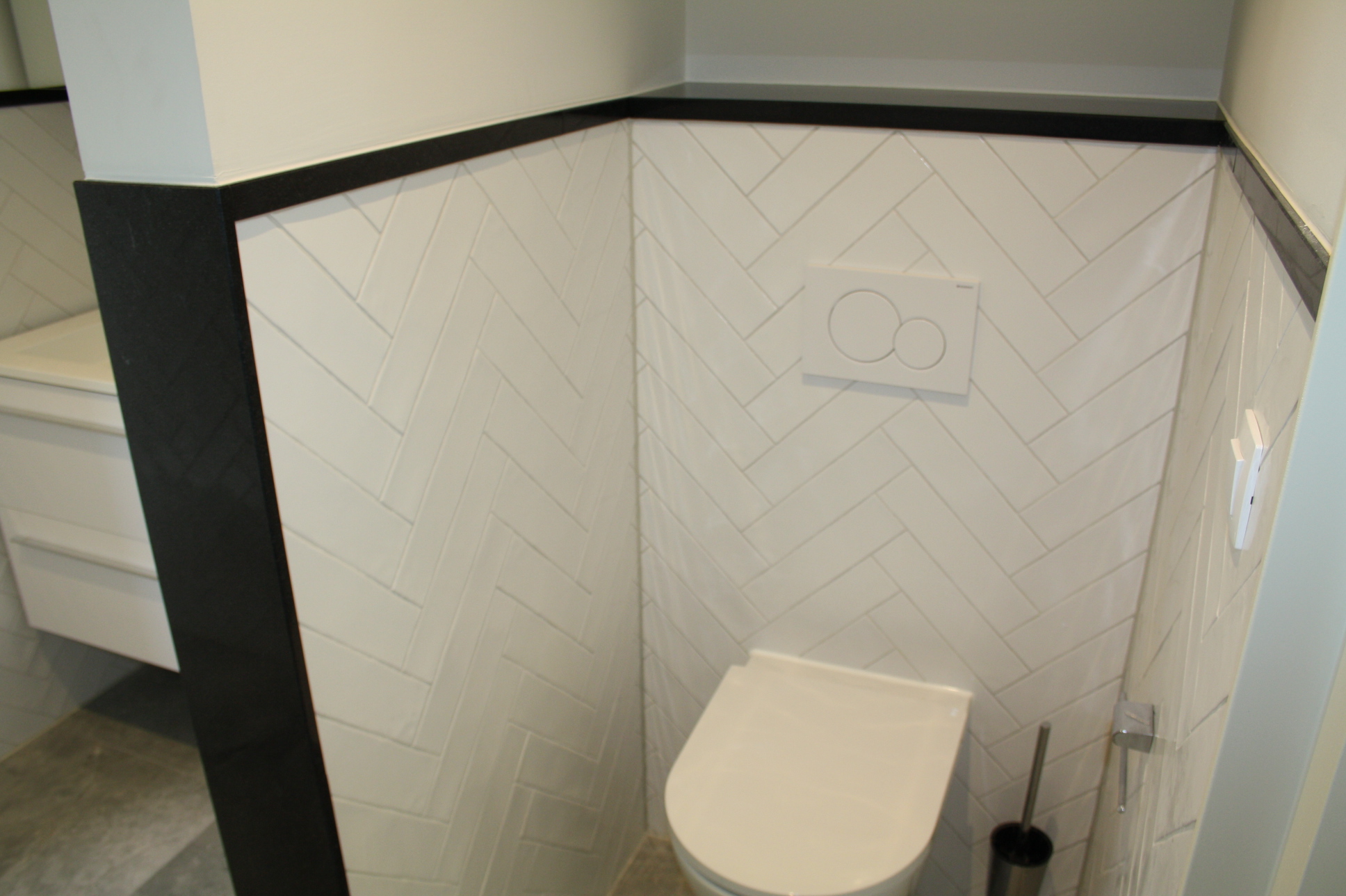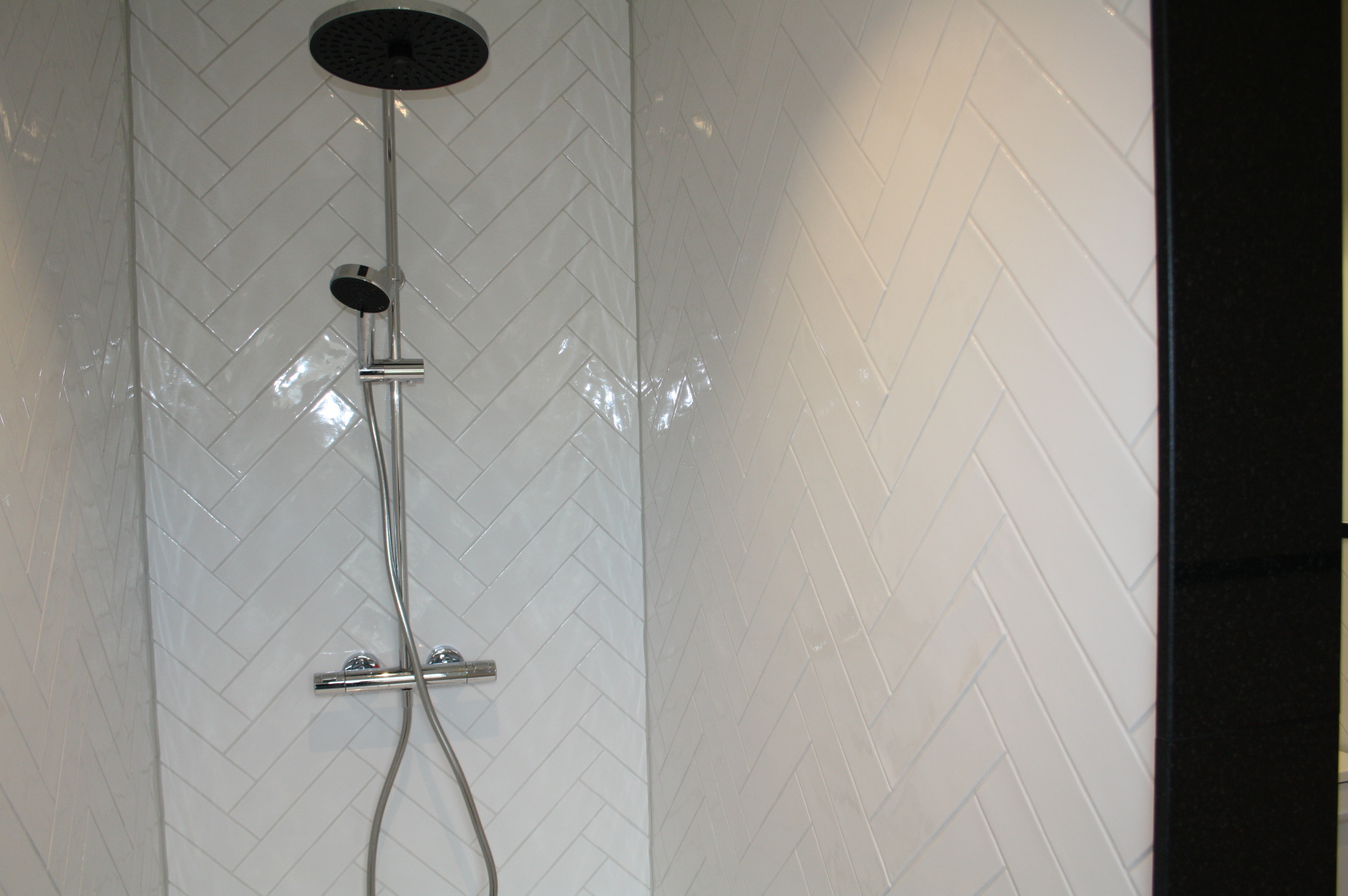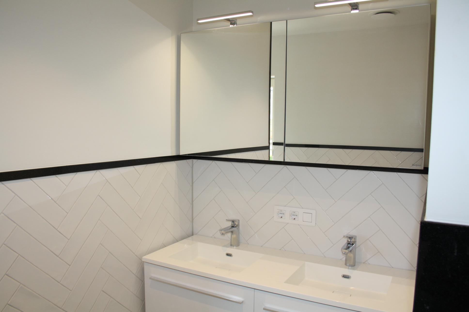 Geheel betegelde luxe badkamer (2.13 x 3,43) met inloopdouche, dubbele wastafel met bad-meubel, 2e toilet.