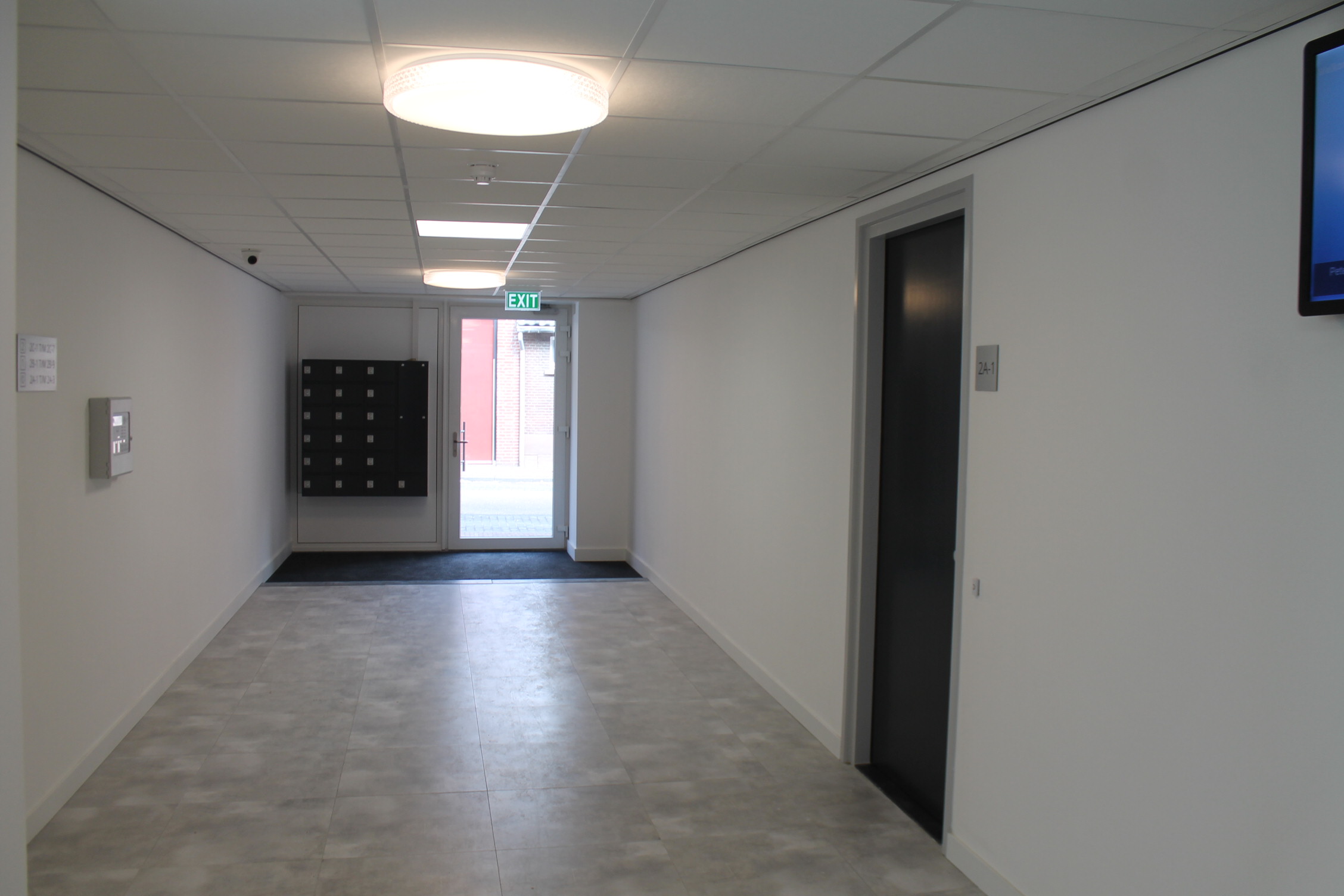 Ruime centrale hal/entree met toegang tot de lift het trappenhuis en de algemene fietsenstalling. Videobewaking, brievenbussen, automatische deuropener en videofoon.