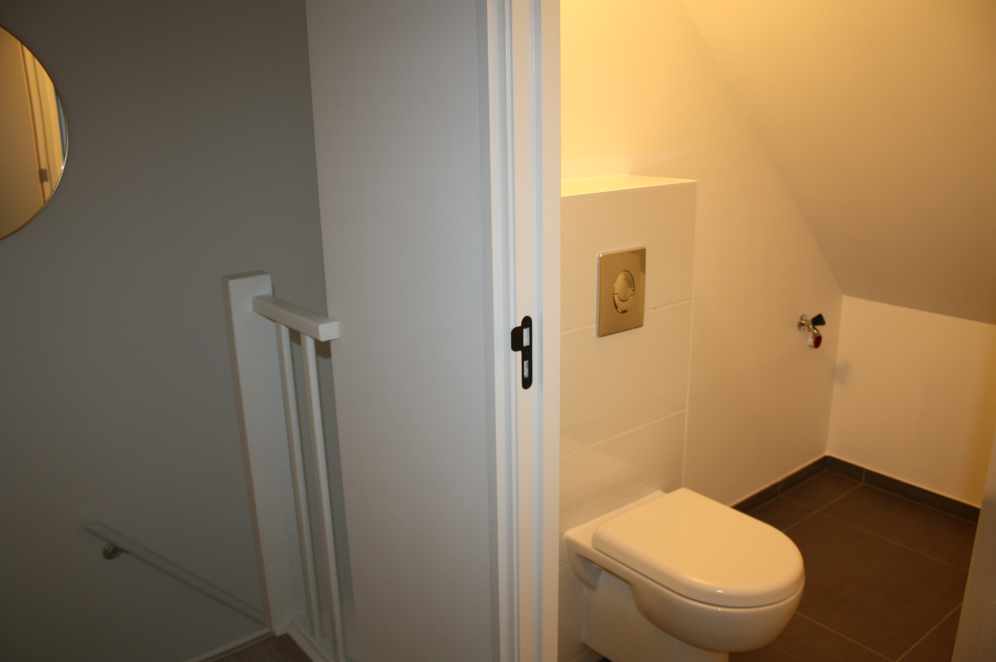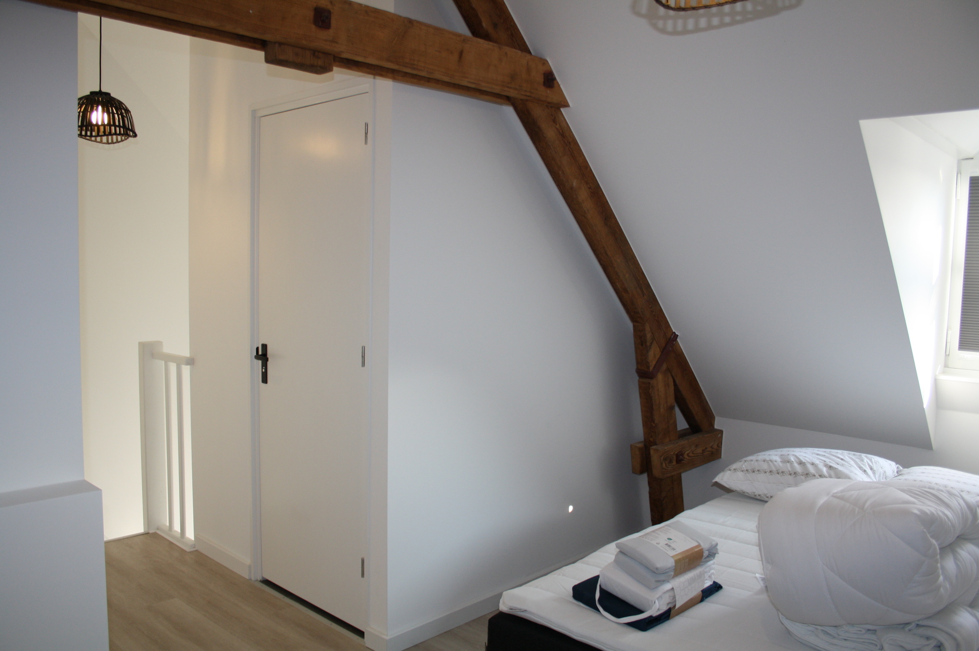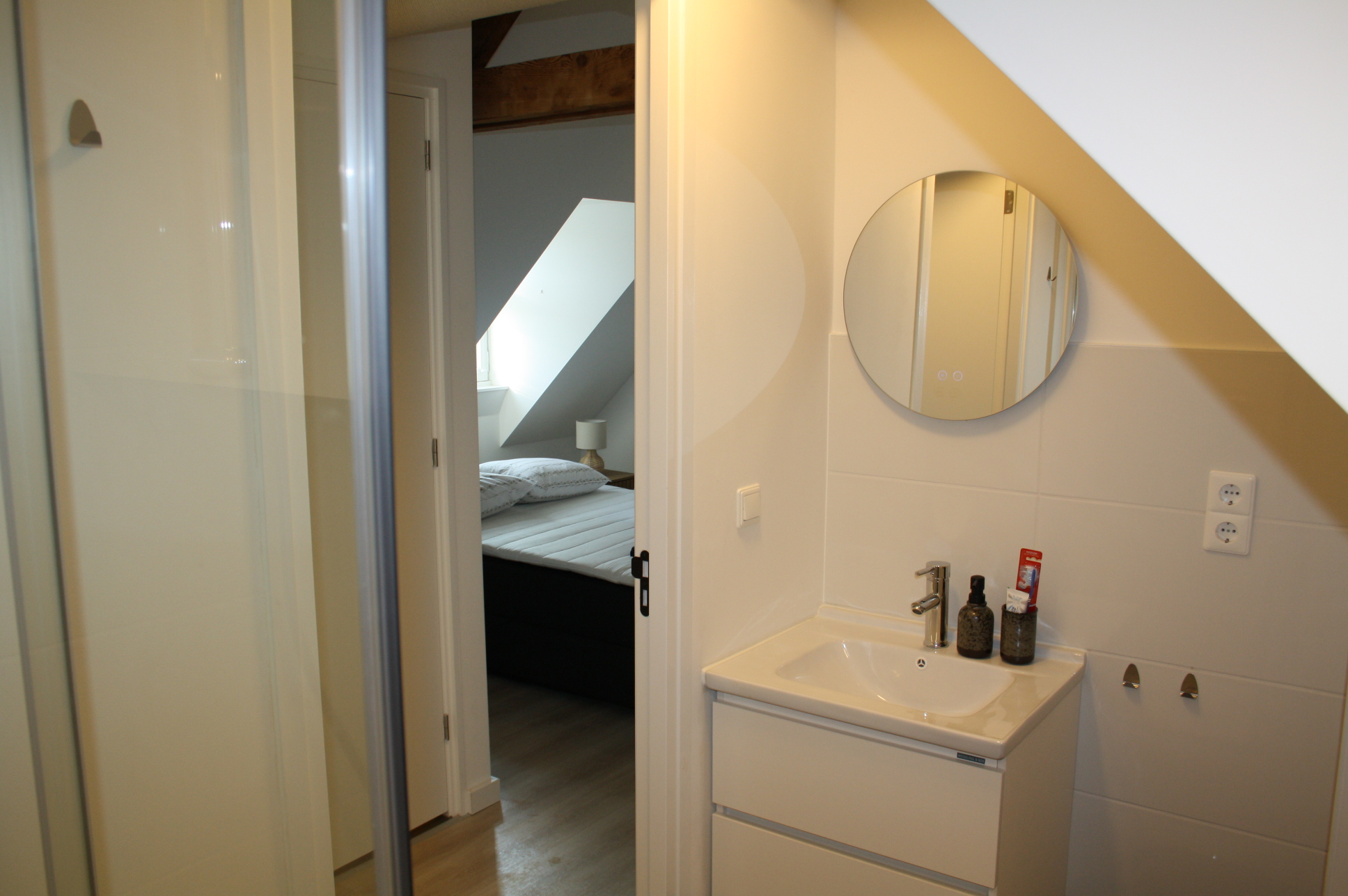Slaapkamer (2.59 x 4.65) met oude spanten en toegang tot de moderne badkamer (circa 2.21 x 2.31) met douche voorzien van douchecabine, wastafel met badmeubel, wasmachine aansluiting. Separaat toilet (1.38 x 1.45).