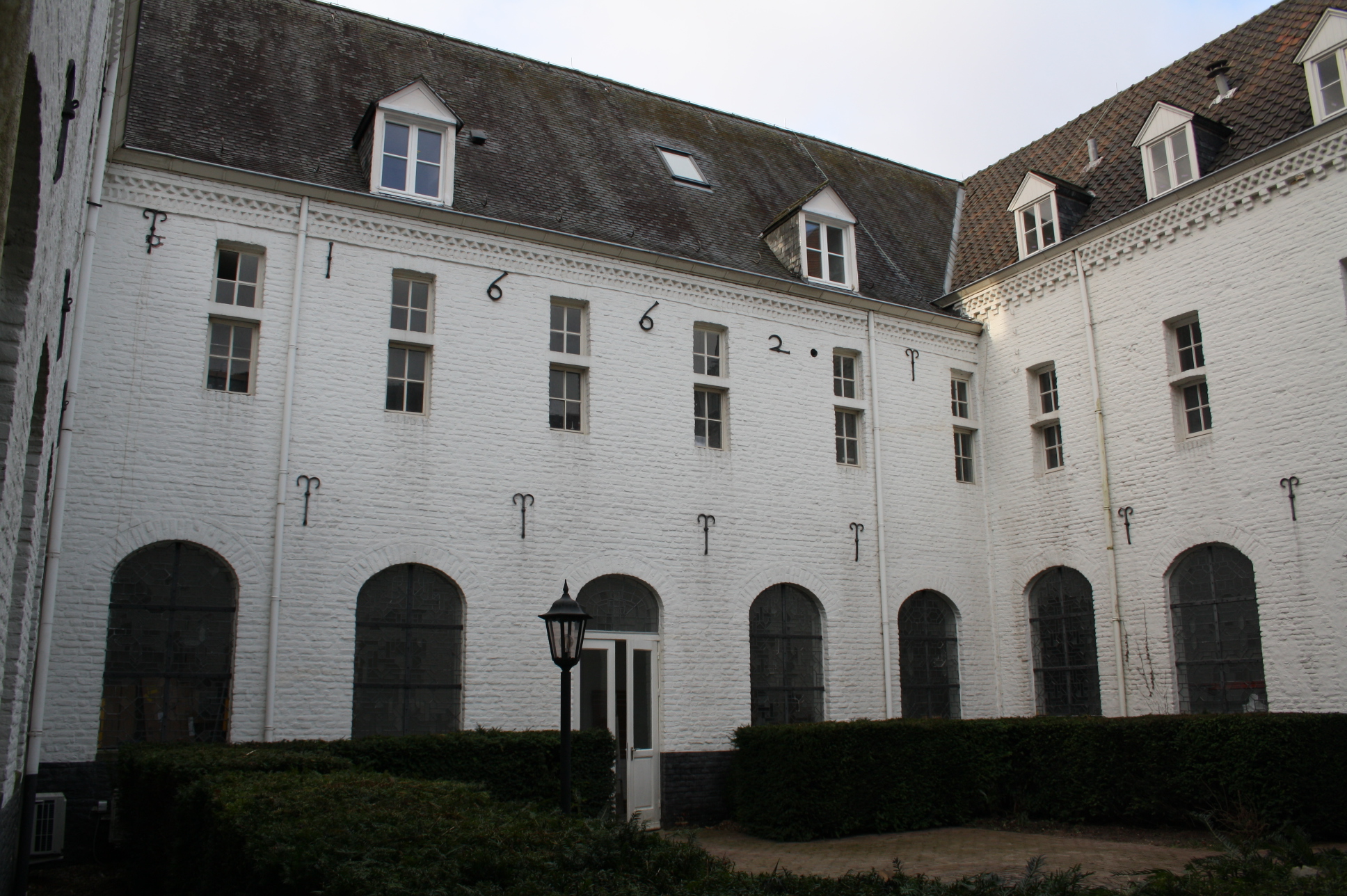 Gemeenschappelijke hoofdentree, deze entree biedt direct toegang tot het schitterende complex. De gangen hebben prachtige glas in loodramen met zicht op de binnenplaats en veel lichtinval. De gemeenschappelijke binnenplaats komt telkens terug en dient als het middelpunt van het authentieke complex.