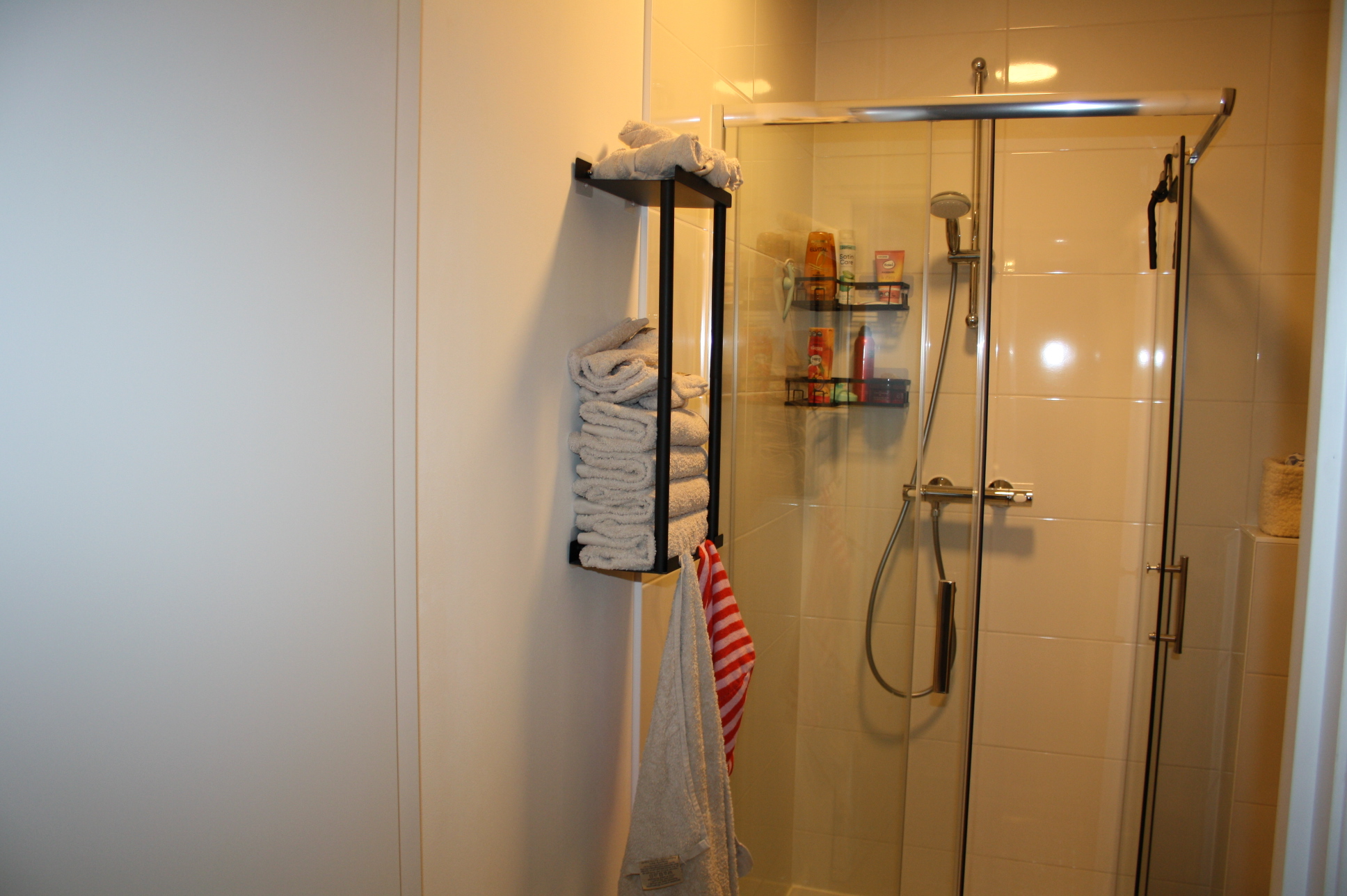 Slaapkamer (4.43 x 3.14) met oude spanten en toegang tot de modern (circa 1.95 x 2.70) met douche voorzien van douchecabine, wastafel met badmeubel, wasmachine aansluiting en toilet.