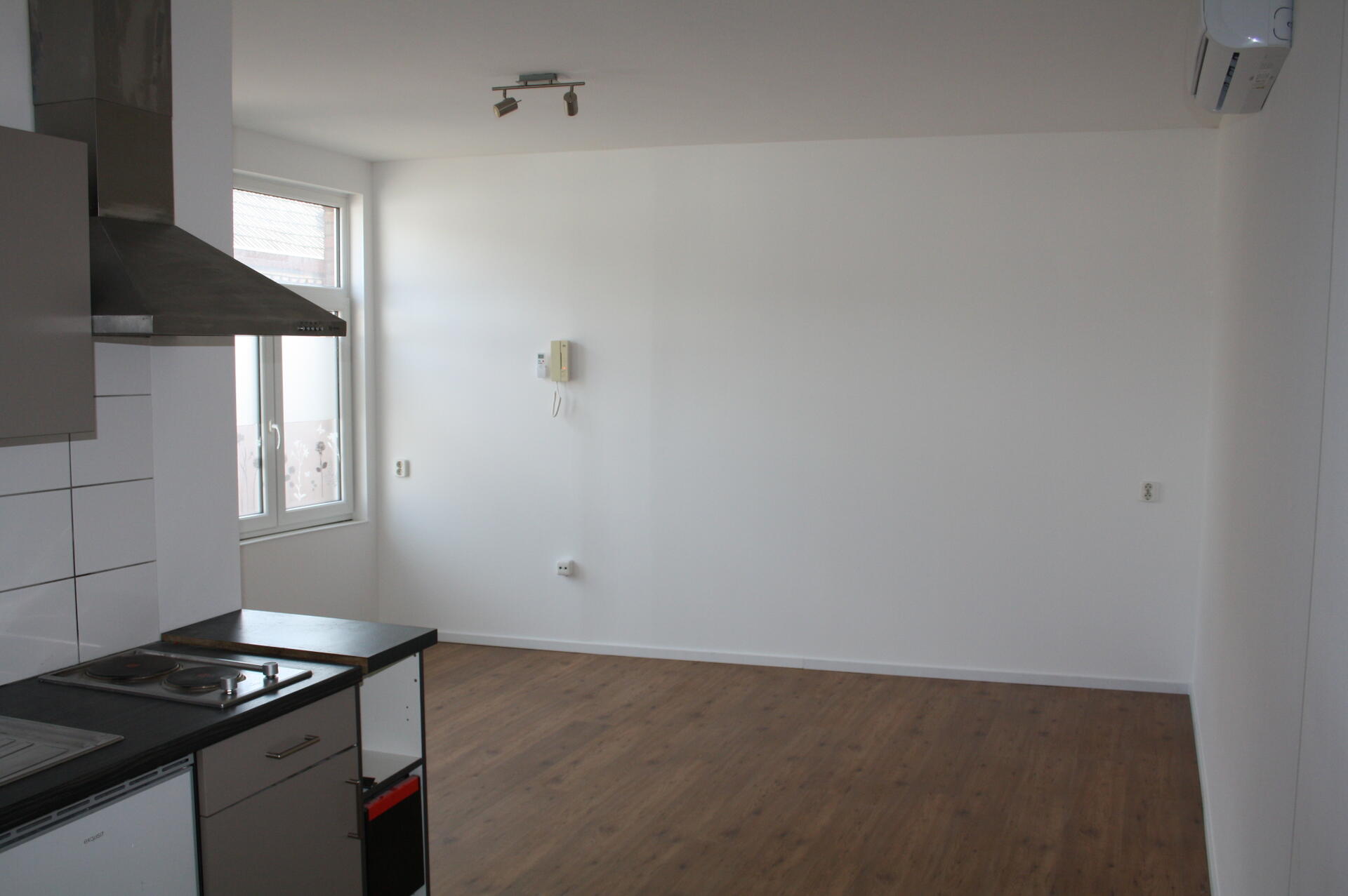 Woon/slaapkamer (circa 25m2) met modern keukenblok en laminaatvloer. Het keukenblok is v.v. voldoende kastruimte, koelkast, 2-pits elektrische kookplaat en afzuiging.