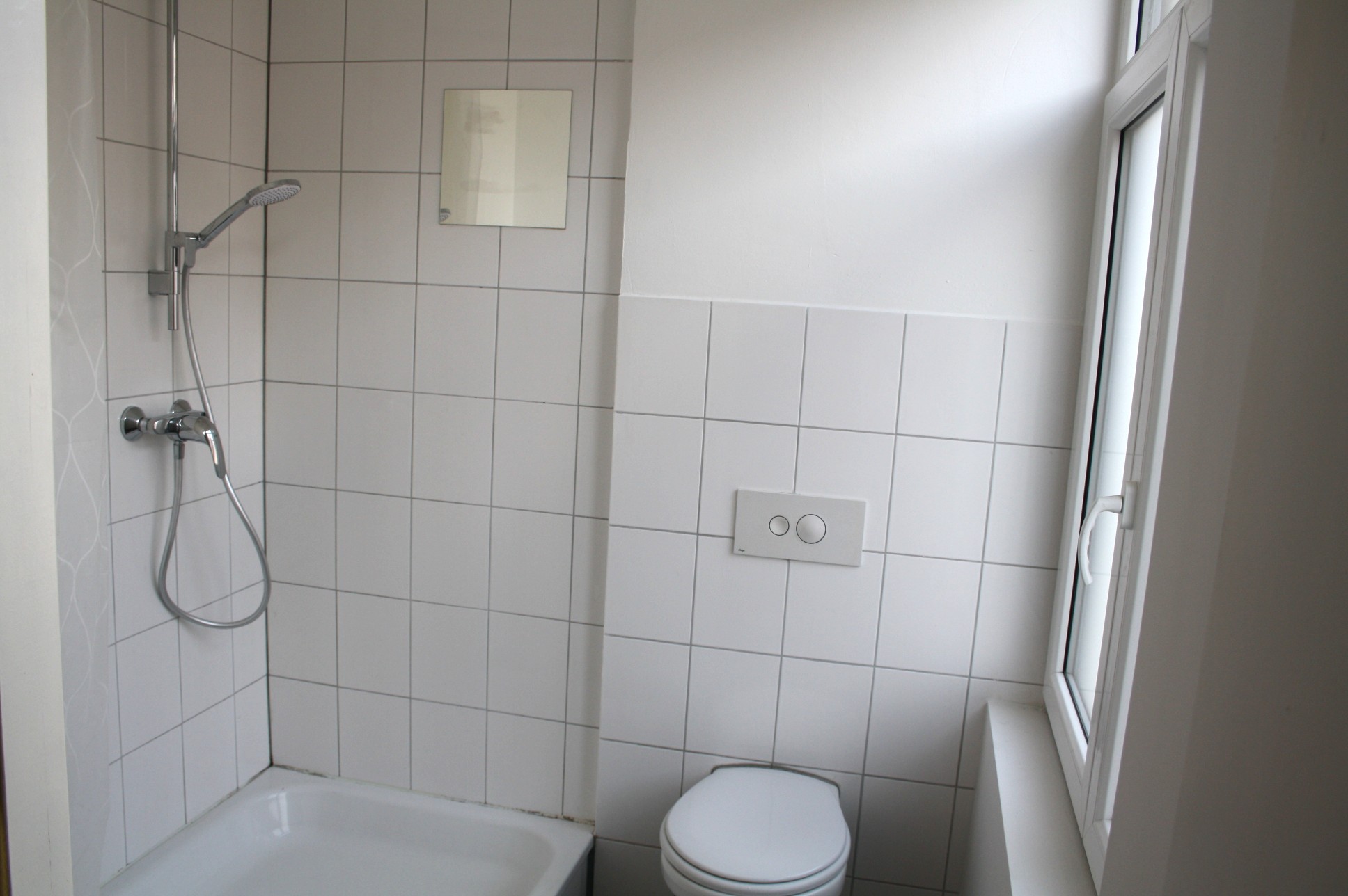 Betegelde badkamer (1.85 x 1.60) v.v. tegelvloer, douche, wasbak en toilet.
