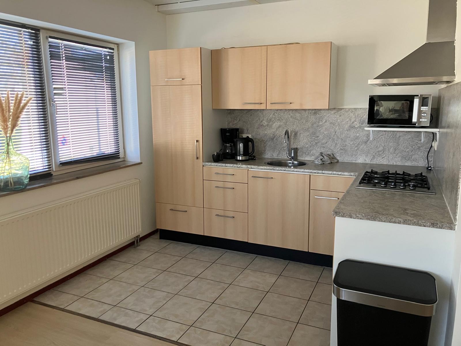 Ruime hal (18m2), berging (4m2) met opstelplaats voor CV-combi installatie en WTW-unit. Tevens bevinden zich hier witgoedaansluitingen. Ruime woonkamer met open keuken (37m2). De keuken is voorzien van een gaskookplaat, vaatwasser, afzuigkap en koelkast. Badkamer (8m2) is voorzien van ligbad, instapdouche en vaste wastafel. Aparte toiletruimte met wandcloset en fonteintje.