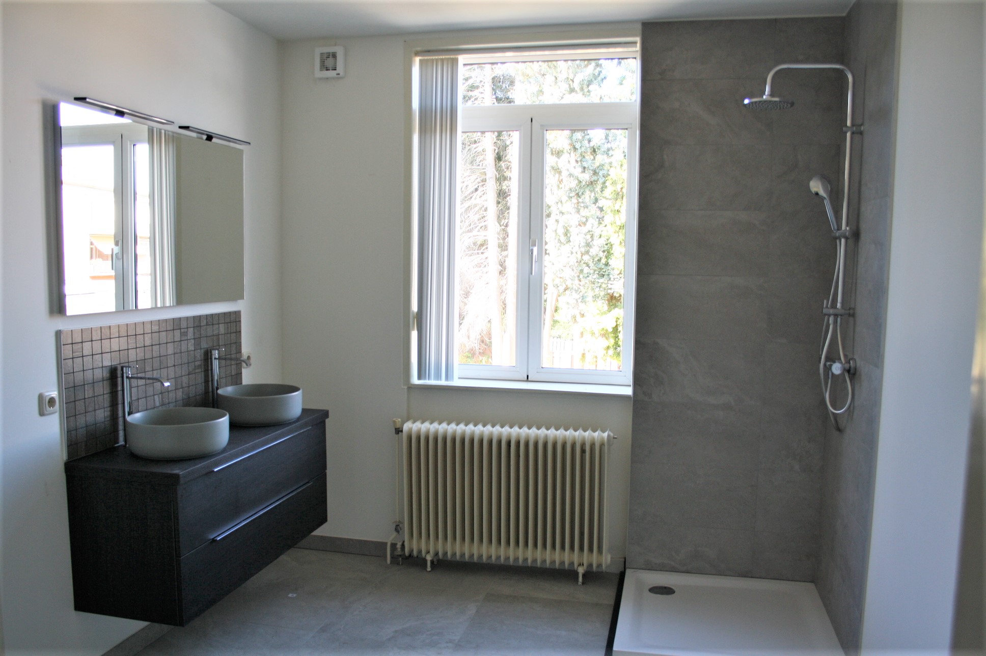 Moderne en geheel vernieuwde badkamer (3.35 x 3.00) met douche, douchecabine, badmeubel met dubbele wastafel en 2e toilet.